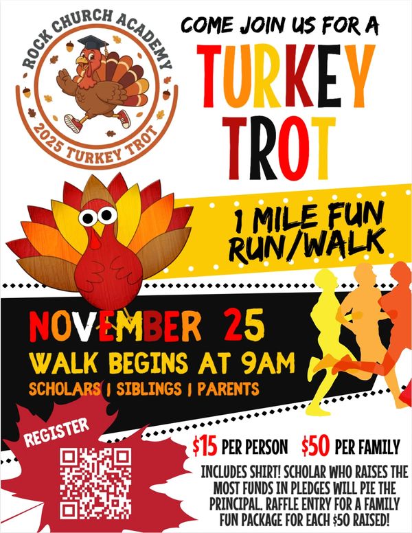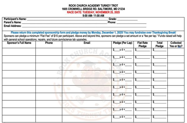 There is a minimum donation/registration of $15 required to participate. The scholar who raises the most funds will be able to "Pie the Principal." Scholars will be entered into a drawing for a "Family Fun Pack" for every $50 raised. All pledges are due by December 1, 2025, so that you have time to collect support from family and friends over Thanksgiving Break! Click here or the pledge sheet image to download Turkey Trot Pledge Sheets!